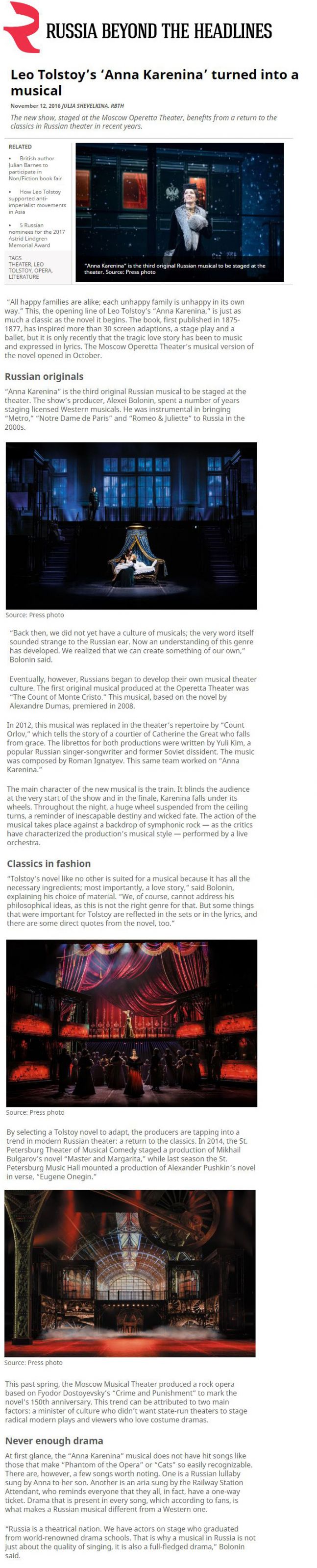 Газета Russia Beyond the Headlines: ‘Leo Tolstoy’s ‘Anna Karenina’ turned into a musical’