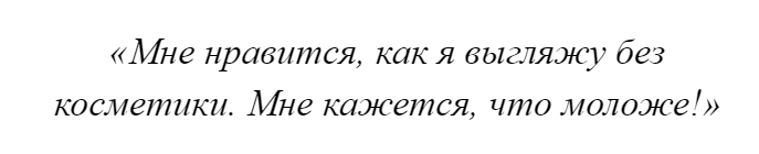 Вне работы я всегда стараюсь максимально давать лицу отдохнуть и не крашусь! Только если пробы или деловая встреча, крашусь вне сцены. Да и мне нравится, как я выгляжу без косметики. Мне кажется, что моложе!