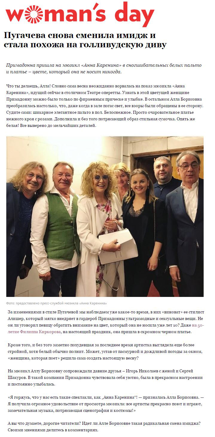 Woman's day: «Примадонна пришла на мюзикл «Анна Каренина» в сногсшибательных белых пальто и платье»