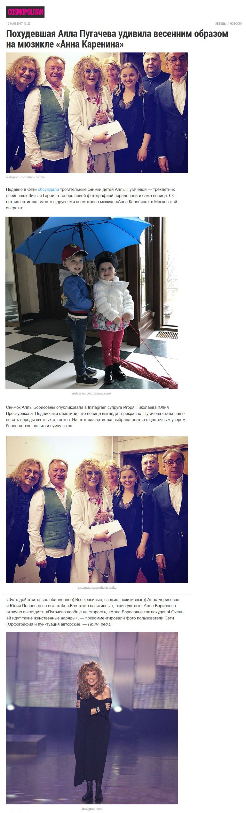 Журнал COSMOPOLITAN: «Похудевшая Алла Пугачева удивила весенним образом на мюзикле «Анна Каренина»