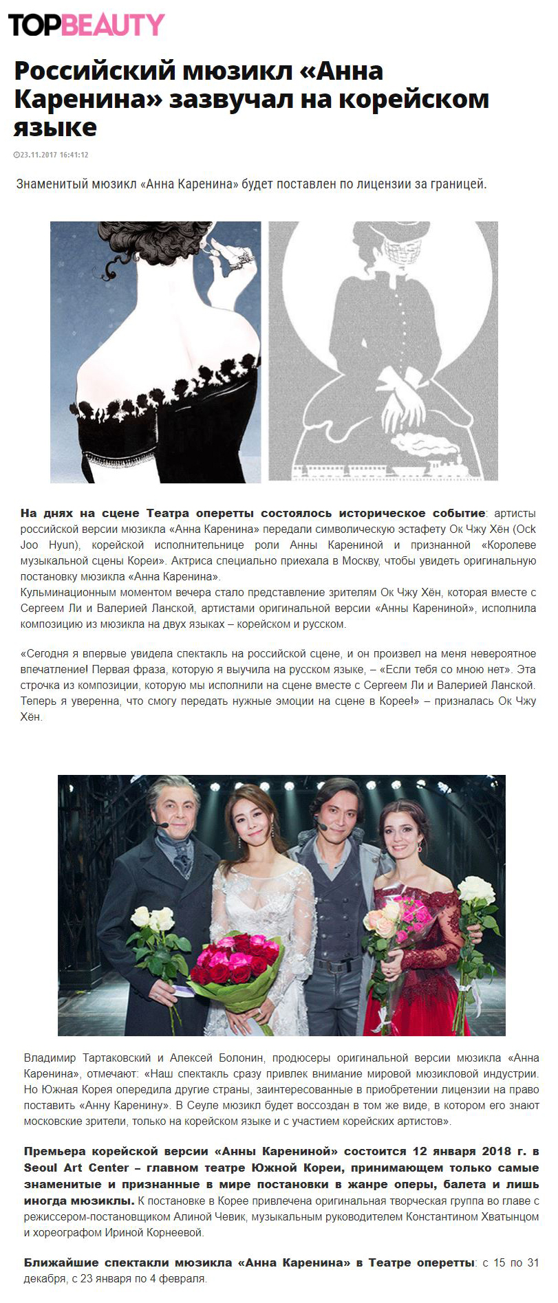 Журнал TOPBEAUTY: «Российский мюзикл «Анна Каренина» зазвучал на корейском языке»